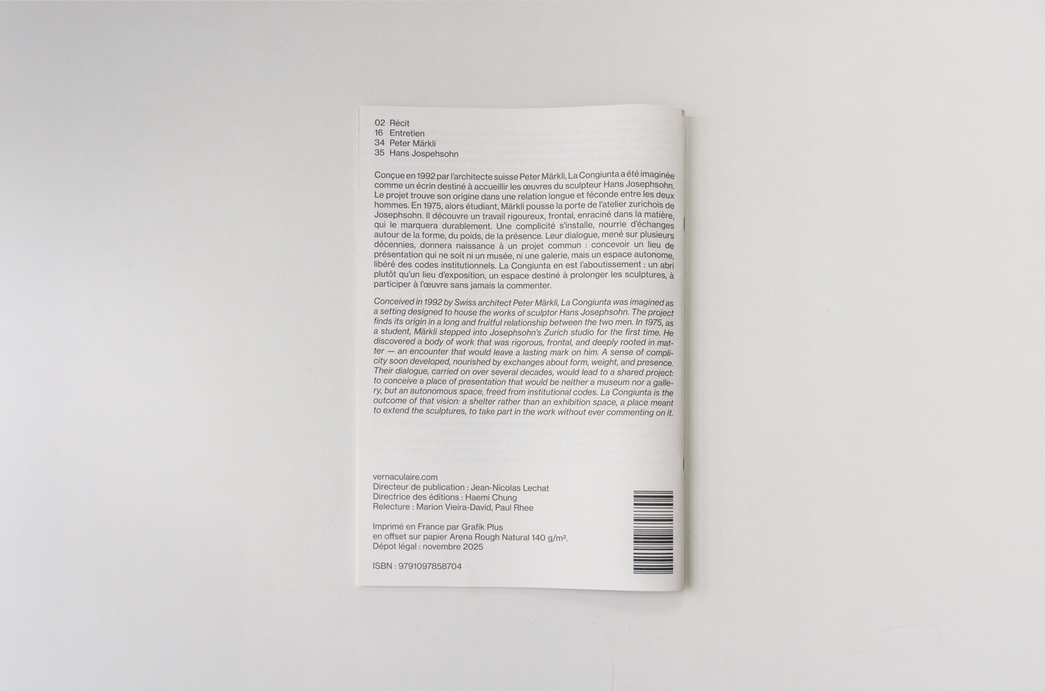 Conçue en 1992 par l’architecte suisse Peter Märkli, La Congiunta a été imaginée comme un écrin destiné à accueillir les œuvres du sculpteur Hans Josephsohn. Le projet trouve son origine dans une relation longue et féconde entre les deux hommes. En 1975, alors étudiant, Märkli pousse la porte de l’atelier zurichois de Josephsohn. Il découvre un travail rigoureux, frontal, enraciné dans la matière, qui le marquera durablement. Une complicité s’installe, nourrie d’échanges autour de la forme, du poids, de la présence. Leur dialogue, mené sur plusieurs décennies, donnera naissance à un projet commun : concevoir un lieu de présentation qui ne soit ni un musée, ni une galerie, mais un espace autonome, libéré des codes institutionnels. La Congiunta en est l’aboutissement : un abri plutôt qu’un lieu d’exposition, un espace destiné à prolonger les sculptures, à participer à l’œuvre sans jamais la commenter.